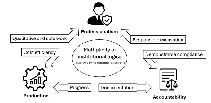 Excavation works are essential for maintaining and developing infrastructure but still causes about 50,000 excavation damages annually despite the Wibon, CROW 500, and the Klic system. These damages can have major societal consequences. Many damages occur due to insufficiently following of excavation regulations, suggesting that rule compliance is not rational but shaped by social constructions (e.g. assumptions, values, rules, and beliefs). This qualitative study explored how institutional logics shape compliance with excavation regulations.